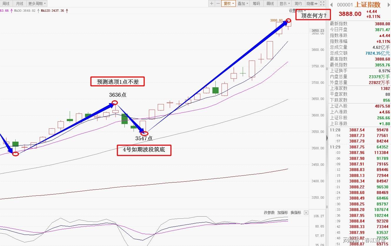 结果,大盘在4号跌至3547点便如期波段筑底,就此展开一轮凌厉的上升波段。今天上午,沪指低开高走,震荡翻红,一举冲上3888点高地,午盘录得一根中阳线。那么,接下来大盘将何去何从?